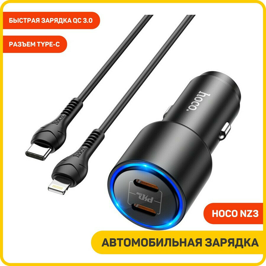 Автомобильное зарядное устройство (АЗУ) Hoco NZ3 QC 3.0 (2 Type-C PD) + кабель Type-C-Lightning, 3 А, черный