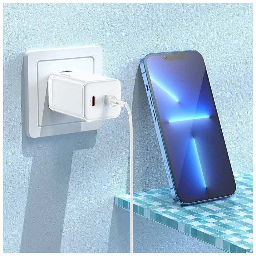 Сетевое зарядное устройство c 2 Type-C HOCO N23 GAN, кабель Type-C to iPhone, (Type-C1 PD, Type-C2 PD, ) max 45W, белое