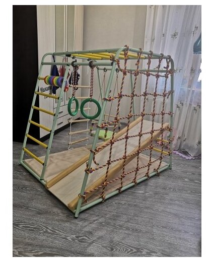 | Плюсы: | Собирается просто. Выдумывать, как вязать канаты не надо, есть простая самозатягивающаяся схема. Комплекс прочный, безопасный. Элементов много, все вешать не нужно сразу, так как будет мешать. Оставил горку и качелю. Кольца и канат с круглой площадкой не вешал, так как тесно. Ребенок в восторге, больше всего использует лестницу, сетку и горку. Рекомендую от 2х до 3х лет по росту примерно. |