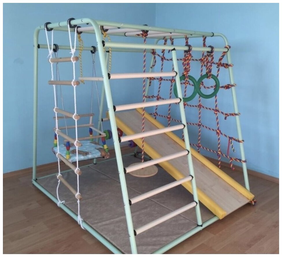 | В комплекте | веревочная лестница, гимнастические кольца, горка, качели, мат, сетка для лазания, тарзанка, трапеция |
