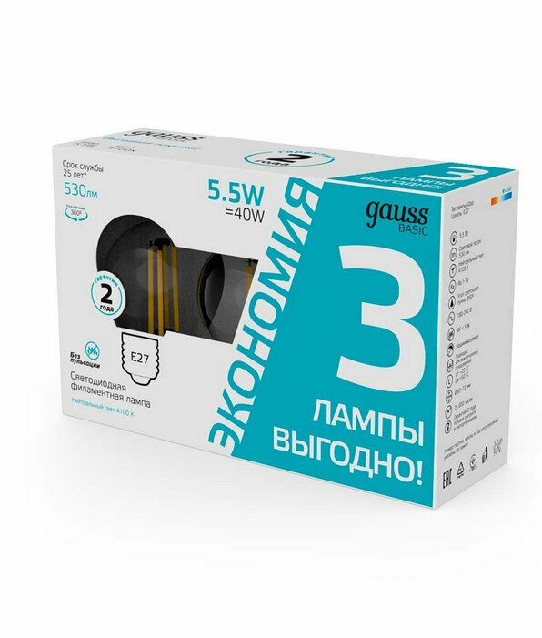 Лампочка светодиодная Е27 Шар 5,5W нейтр-белый свет 4100К 530лм (3 лампы в коплекте) Gauss Basic Filament