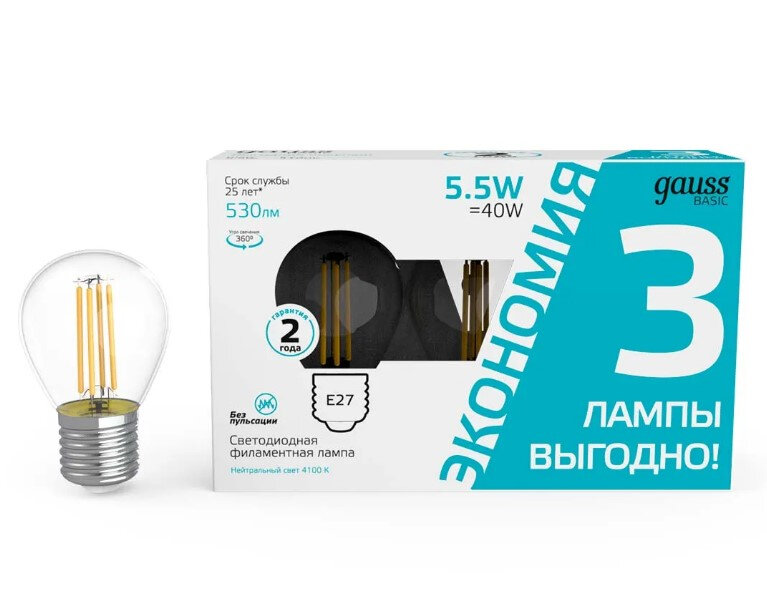 Ниже Вы можете прочитать отзывы на Лампа светодиодная филаментная Gauss E27 4100К 5,5 Вт 530 Лм 175-240 В шар прозрачная (3 шт.), ознакомится с подробными характеристиками, посмотреть интересные обзоры и фотографии на Лампа светодиодная филаментная Gauss E27 4100К 5,5 Вт 530 Лм 175-240 В шар прозрачная (3 шт.).