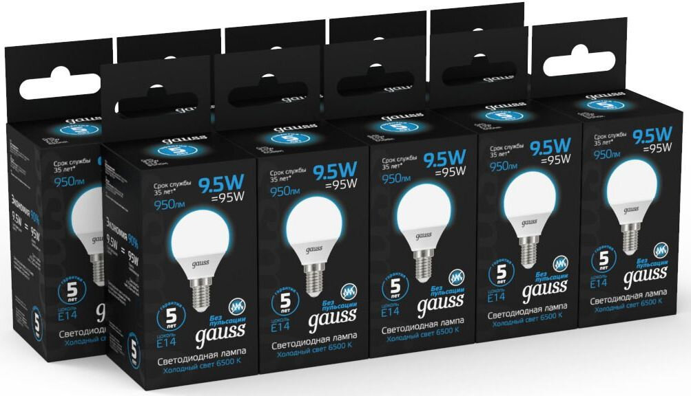 Упаковка ламп 10 штук Gauss Шар 9.5W 950lm 6500K E14 LED 1/10/100