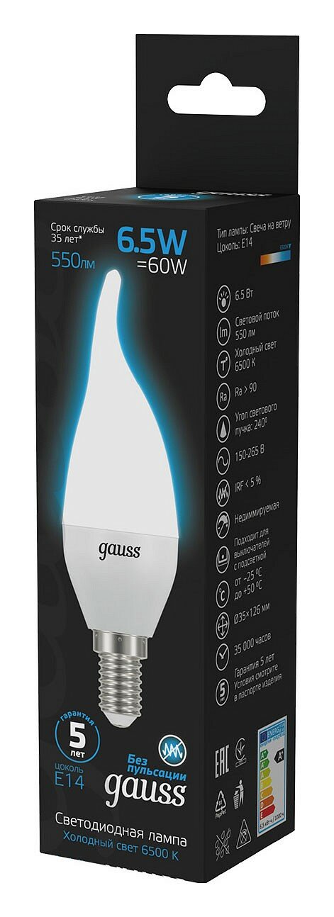 Gauss Лампа Свеча на ветру 6.5W 550lm 6500K E14 LED 1/10/50 104101307