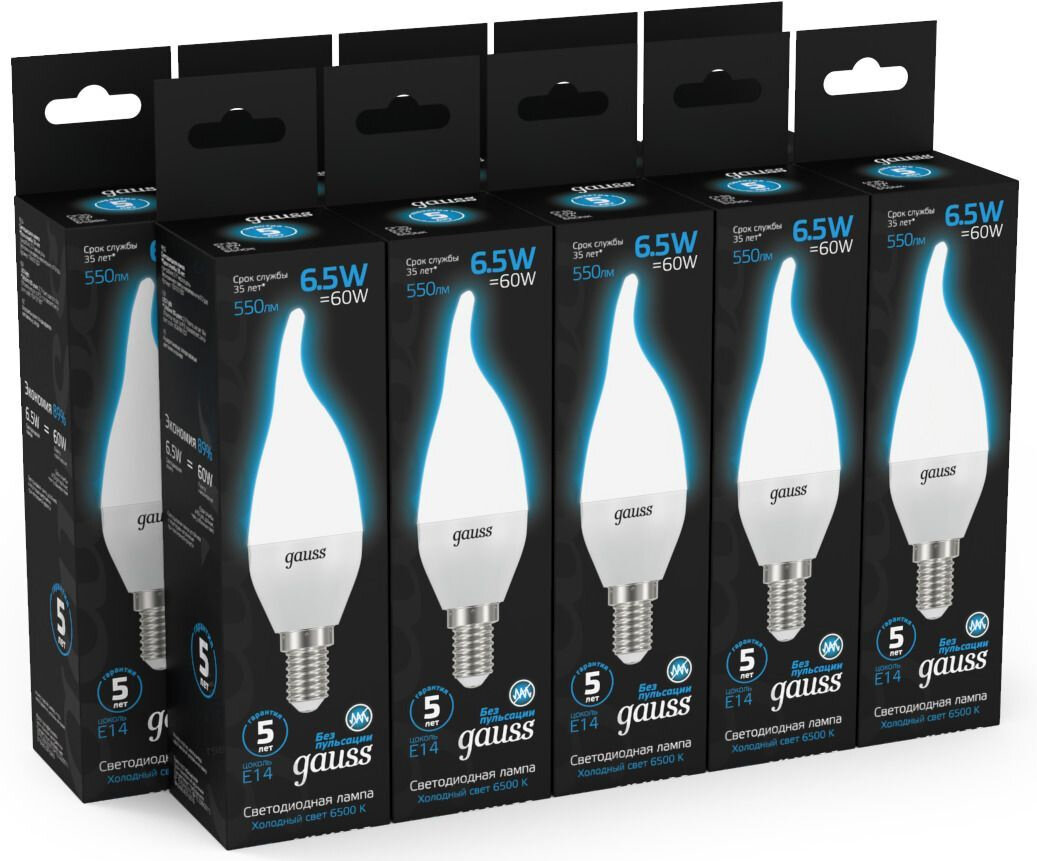 Упаковка ламп 10 штук Gauss Свеча на ветру 6.5W 550lm 6500K E14 LED 1/10/50