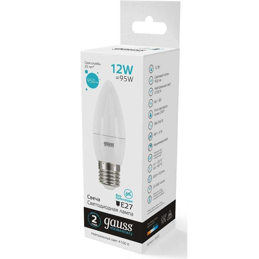 Купить Лампа светодиодная LED 12 Вт 950 Лм белая 4100К E27 свеча Elementary , GAUSS 30222 (1 шт.)