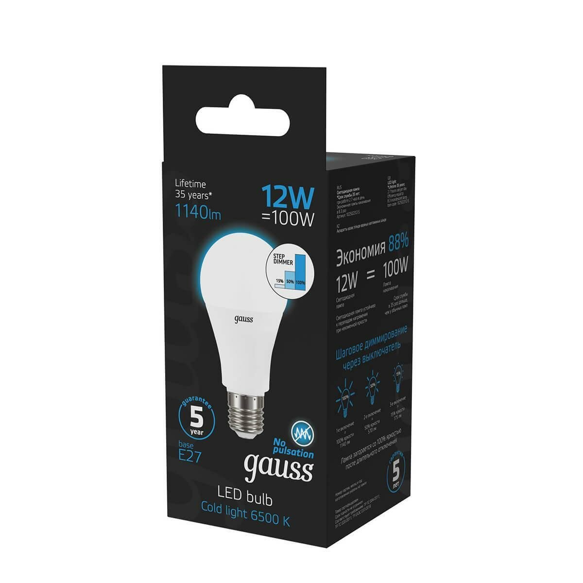 Лампа Gauss A60 12W 1140lm 6500K Е27 шаговое диммирование LED 1/10/50 102502312-S