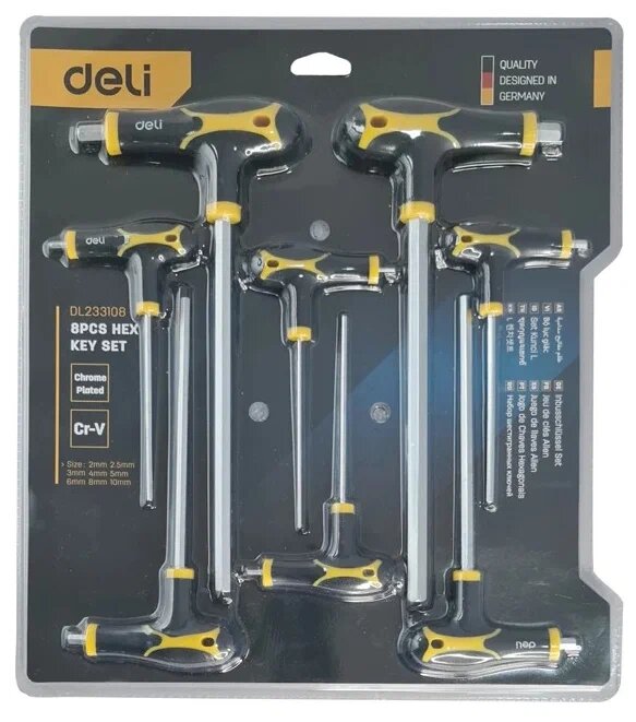 Набор из 8 шестигранных двусторонних ключей с Т-образной ручкой Deli DL233108 (от 2x75мм до 10x200мм, удобная рукоять,CR-V)