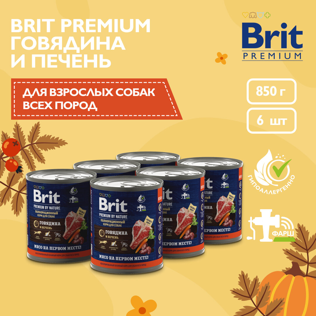 Влажный корм для собак Brit Premium by Nature, для здоровья кожи и шерсти, говядина, печень 6 шт. х 850 г