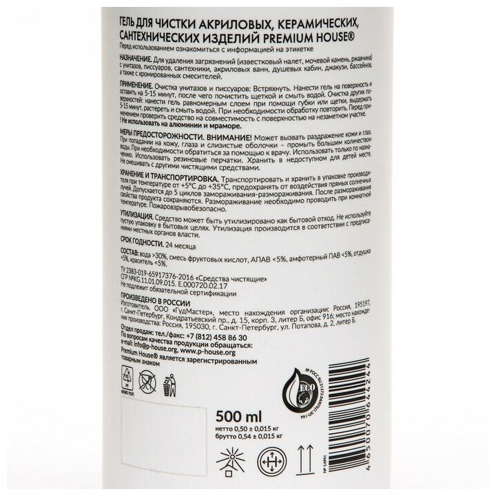 Premium House гель для чистки акриловых, керамических, сантехнических изделий, 0.5 л