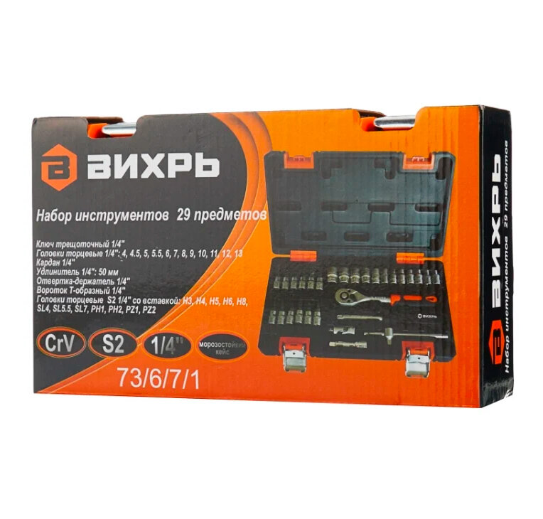 Набор ручного инструмента Вихрь 1/4, CrV, пластиковый кейс, 29 предметов (73/6/7/1)