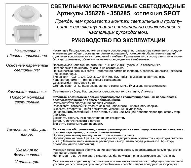 | Дополнительная информация | направленный свет, подходит для натяжных потолков, способ крепления - встраиваемый на пружинах |