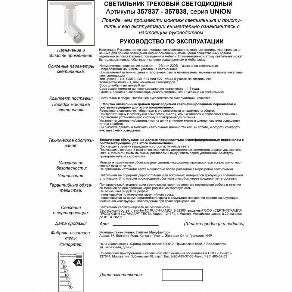 Novotech Трековый светодиодный светильник Novotech Union 357838