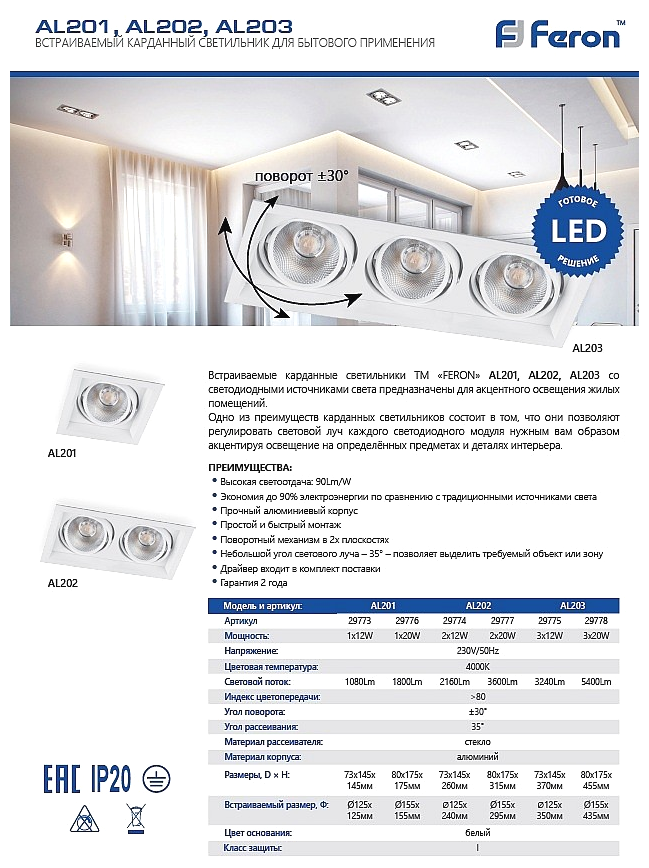 | Дополнительная информация | RAL9016;Поворот головы возможен в 4х направлениях (30 градусов в каждую сторону),индекс цетопередачи >80 |