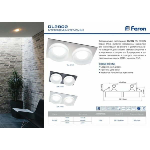 Ниже Вы можете прочитать отзывы на FERON Светильник потолочный встраиваемый, MR16 G5.3, черный DL2902 41138, ознакомится с подробными характеристиками, посмотреть интересные обзоры и фотографии на FERON Светильник потолочный встраиваемый, MR16 G5.3, черный DL2902 41138.