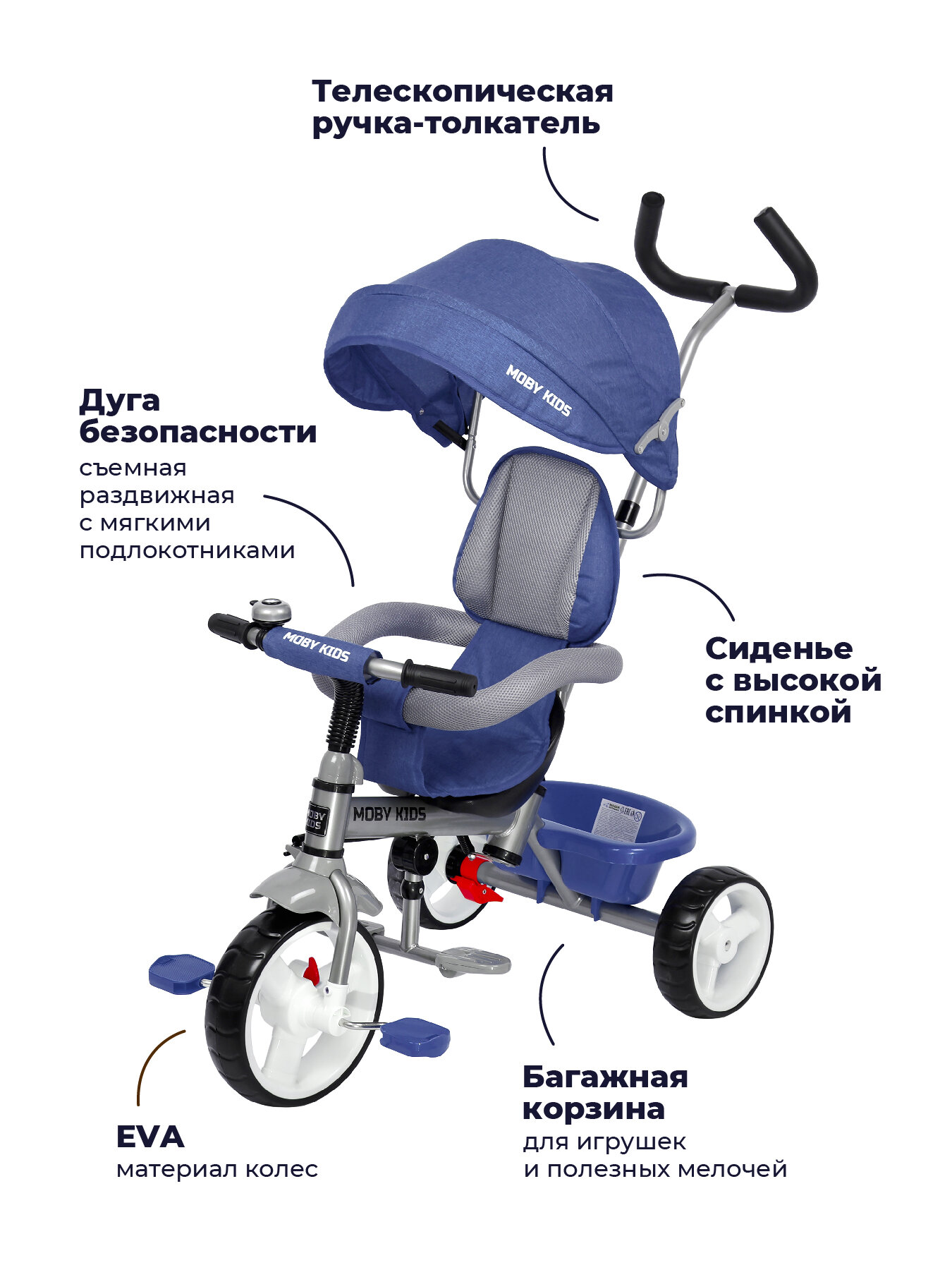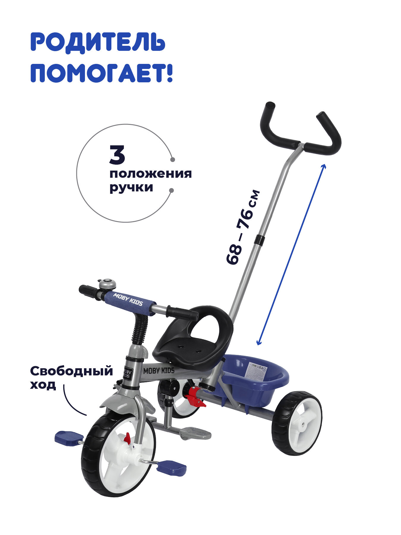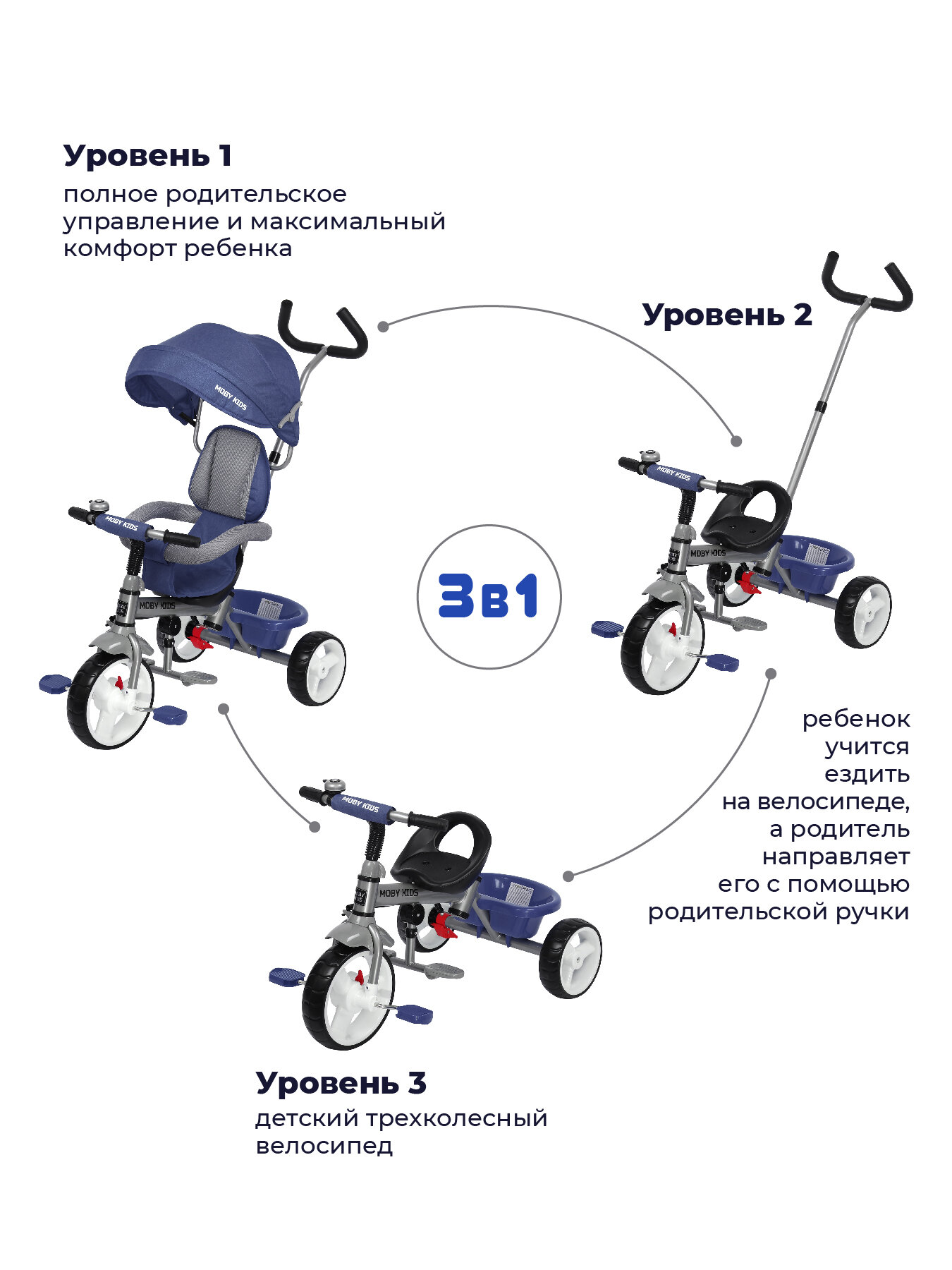 | Дополнительная информация | 3 в 1: велосипед-коляска с полным родительским управлением, трёхколёсный велосипед с ручкой, трёхколёсный велосипед и полное управления ребёнком; наличие переключателя «свободного хода» переднего колеса; звонок на руле; складной тент колясочного типа с фиксаторами положения; большая корзина сзади велосипеда; ножной тормоз |