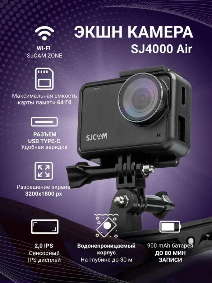 Экшн-камера SJCAM SJ4000 AIR видео до 4K/30FPS (интерполяция), GalaxyCore GC4653, экран основной сенсорный 2", LCD, microSD до 64 гб, батарея 900 мАч,