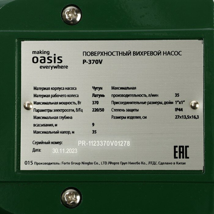 Насос поверхностный Oasis P-370V, вихревой, 370 Вт, 35 л/мин, напор 35 м