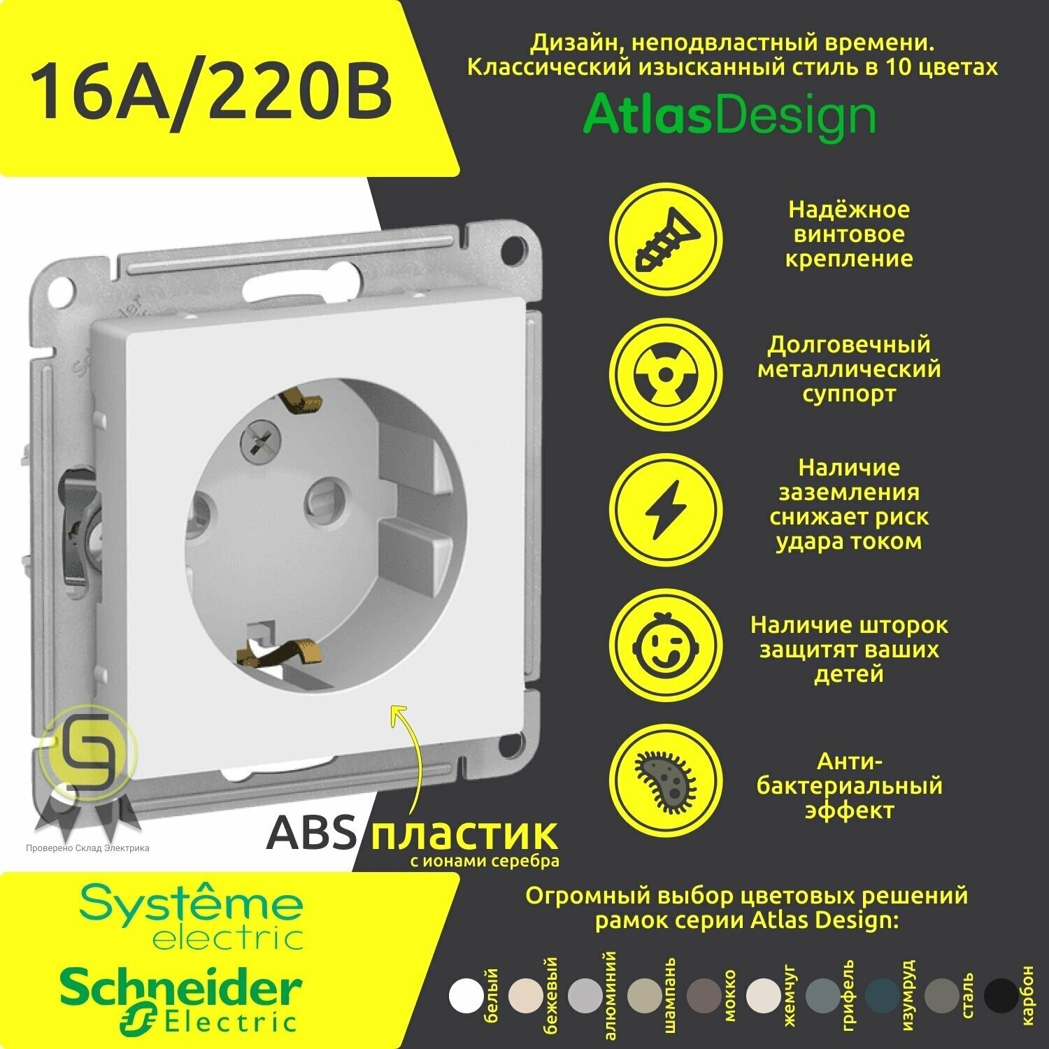 Розетка с заземляющим контактом, со шторками, механизм Монтаж: скрытой установки Цвет: белый Термопласт: антибактериальный, с ионами серебра (Schneider) Systeme Electric AtlasDesign ATN000145 комплект 10шт.