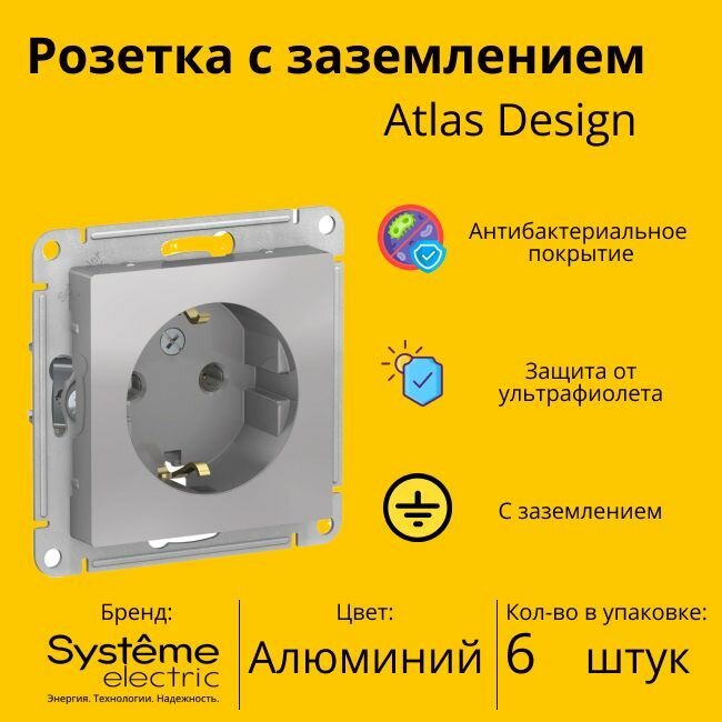 Купить Розетка электрическая Schneider Electric (Systeme Electric) Atlas Design с заземлением, 16А Алюминиевая ATN000343 - 6 шт.