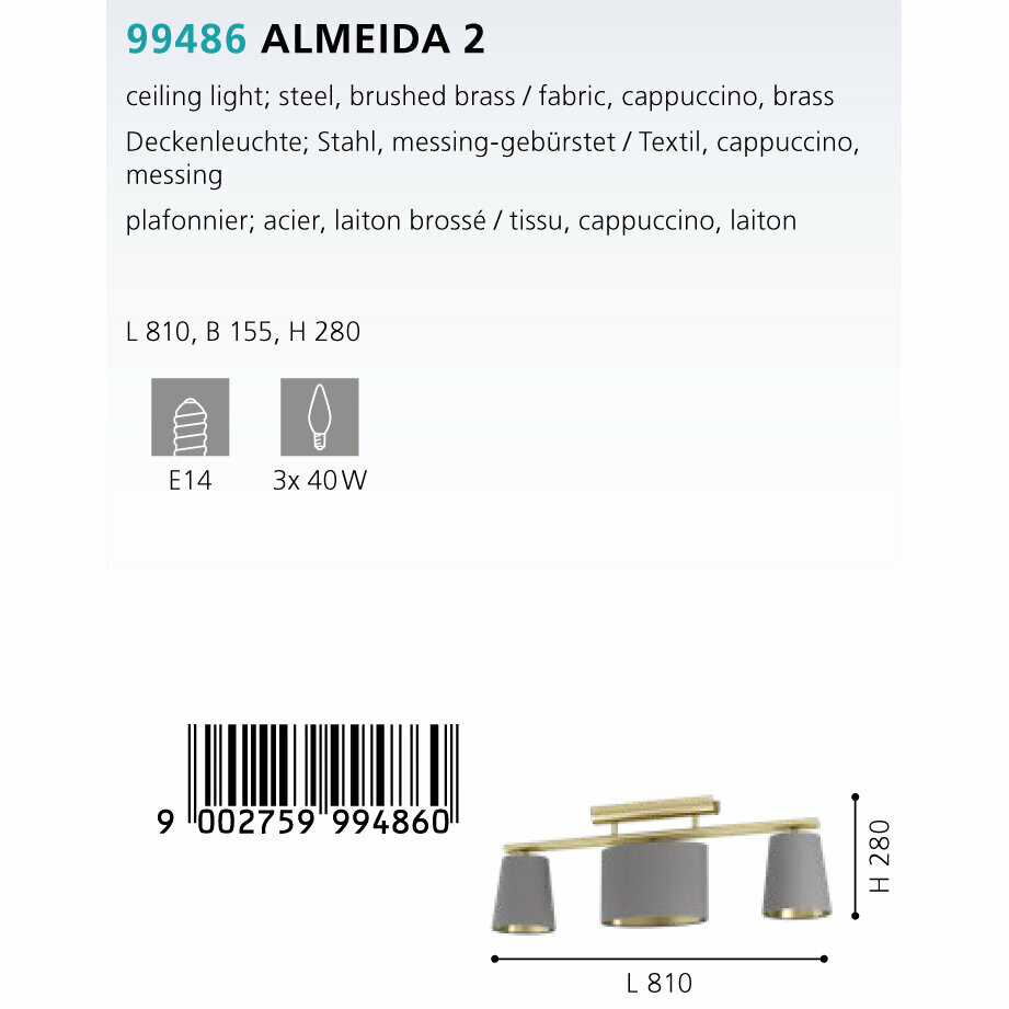 Eglo 99486 Светильник потолочный ALMEIDA 2, 3x40W, E14, L810, B155, H280, сталь/текстиль, капучино/латунь 99486