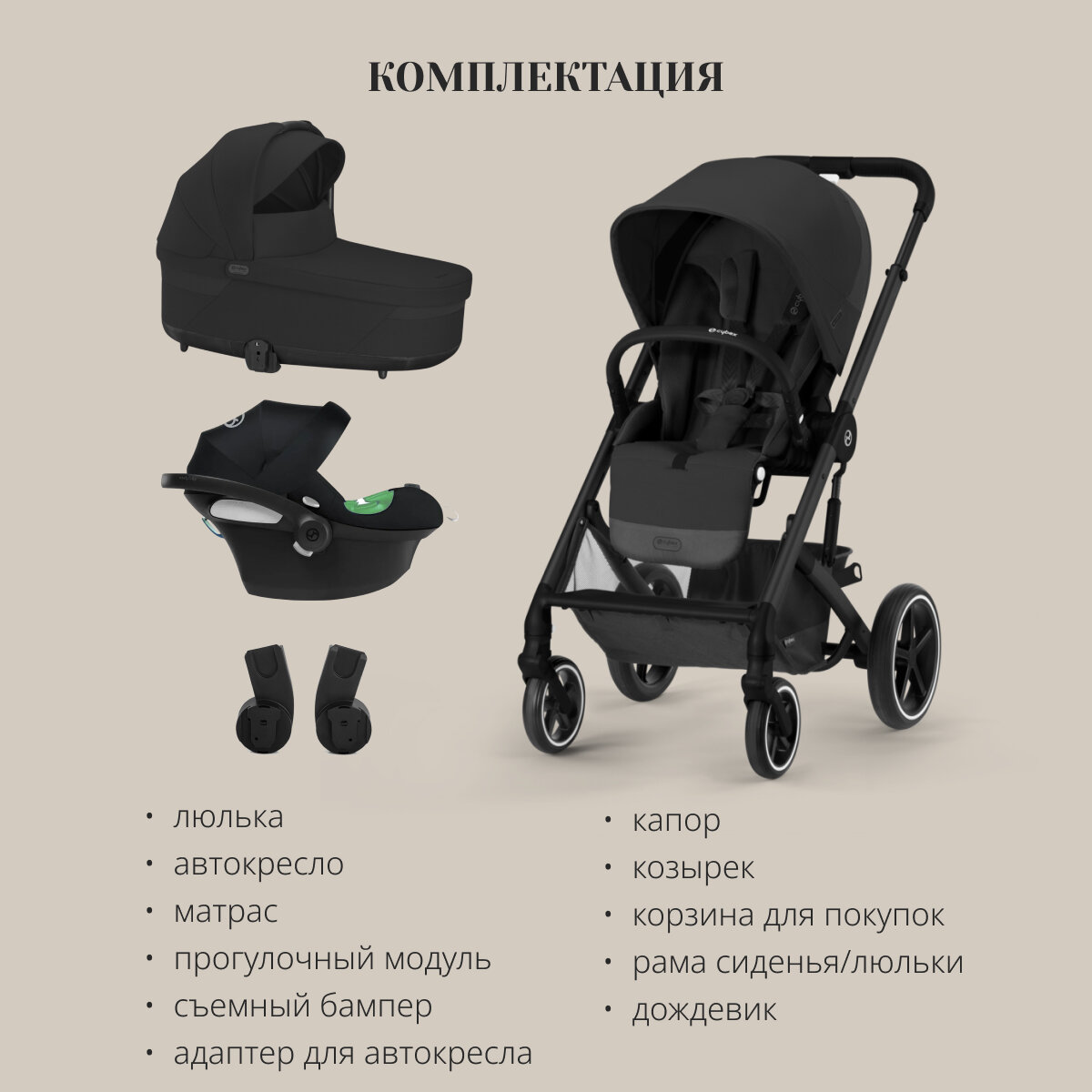 | Комплектация | прогулочная коляска / спальный блок / автокресло / адаптер для установки автокресла / сетка для игрушек и продуктов / бампер для рук ребенка / инструкция на русском языке / гарантийный талон |