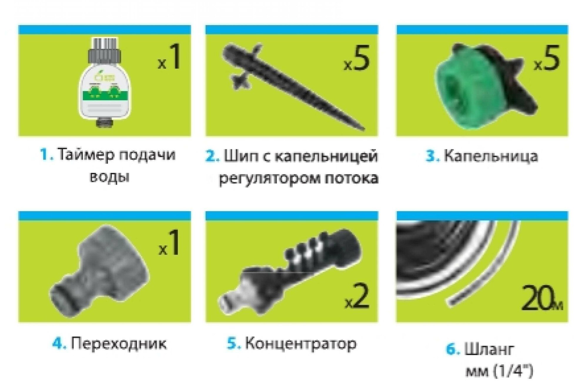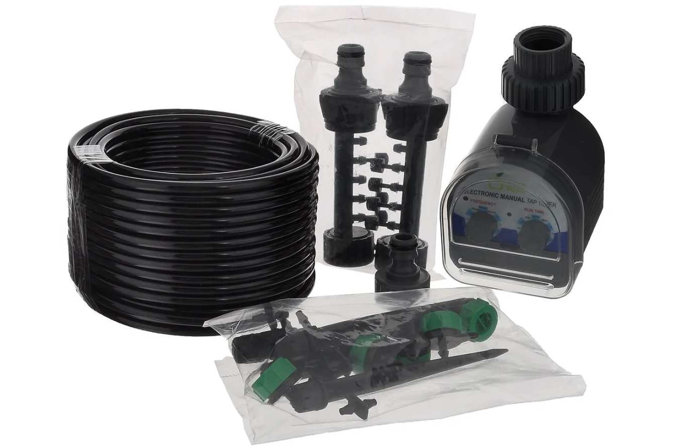 | Комплектация | таймер подачи воды, шип с капельницей и регулятором тока - 5 шт, капельница - 5 шт, переходник, концентратор - 2 шт, шланг 1/4" (6,35 мм) - 20 м |