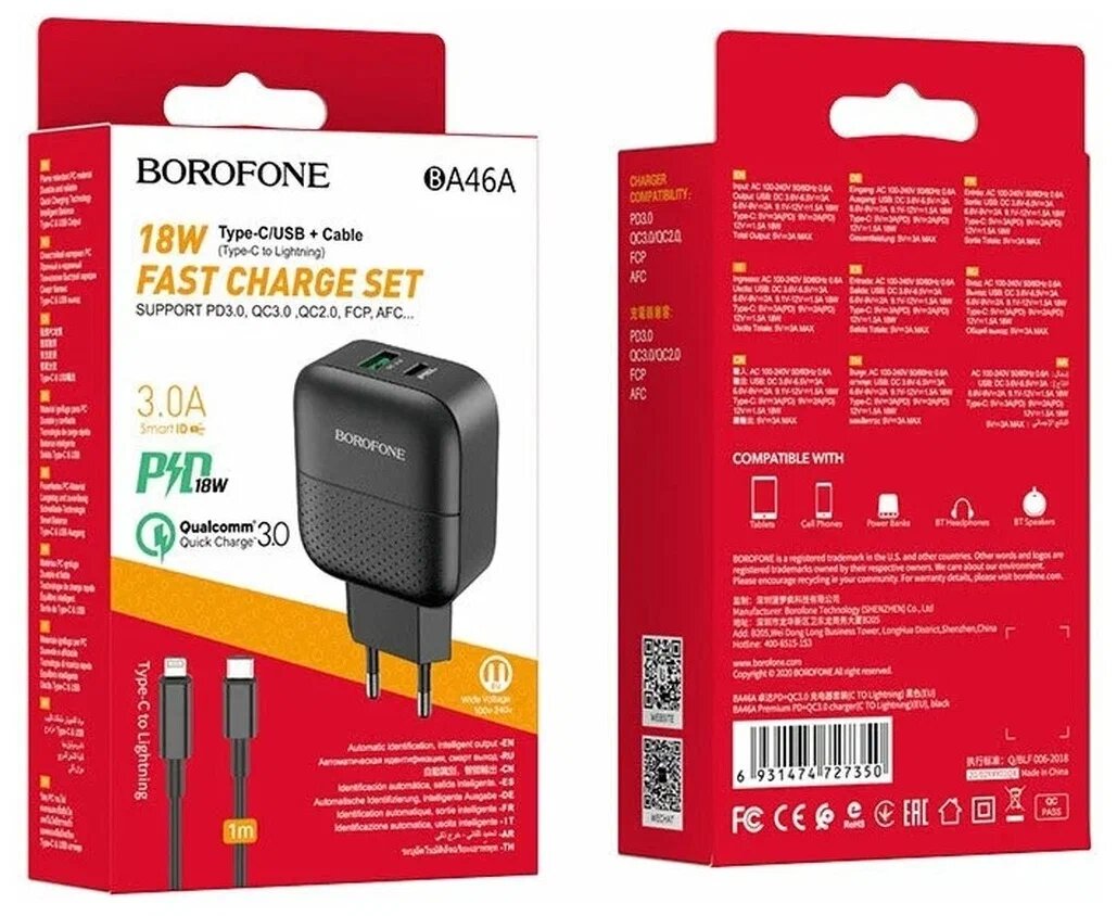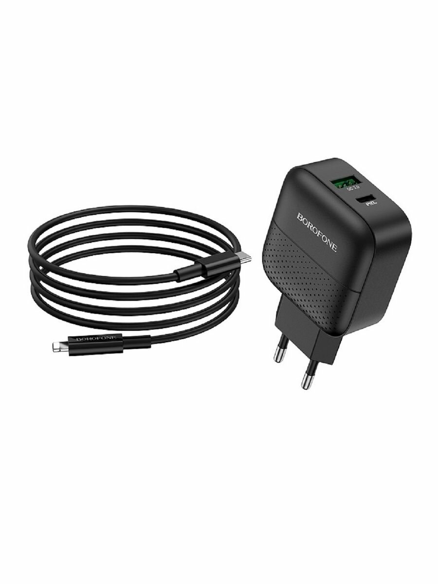 Сетевое зарядное устройство (СЗУ) Borofone BA46A QC 3.0 (USB+Type-C PD) + кабель Lightning, 3 А, черный