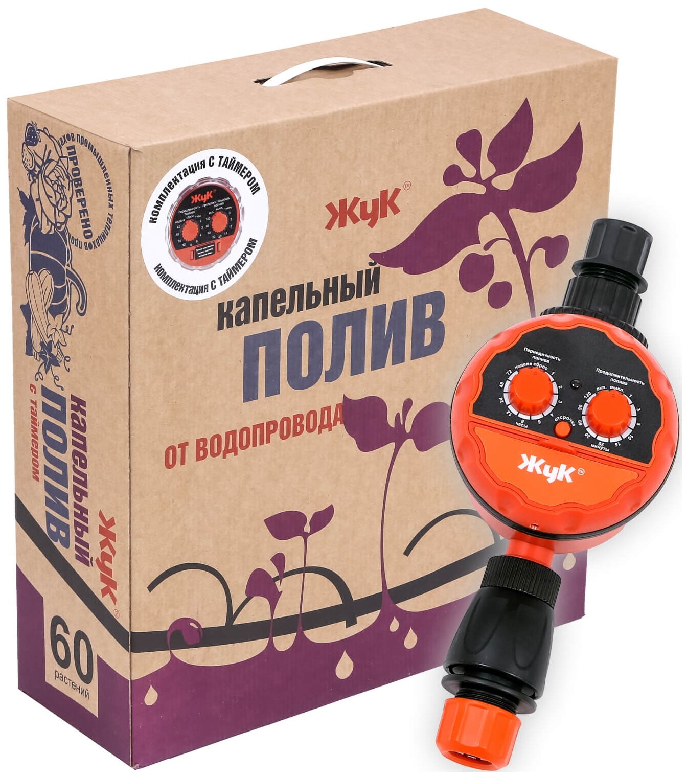 Капельный полив ЖУК от водопровода на 60 растений с таймером. "холодный полив"; выдерживает высокое давление и перепады высот;комплектация: цанговые соединения, компенсированные капельницы DR. DROP, стрелки, микротрубки, фильтр, шланг магистральный, заглу интересное: