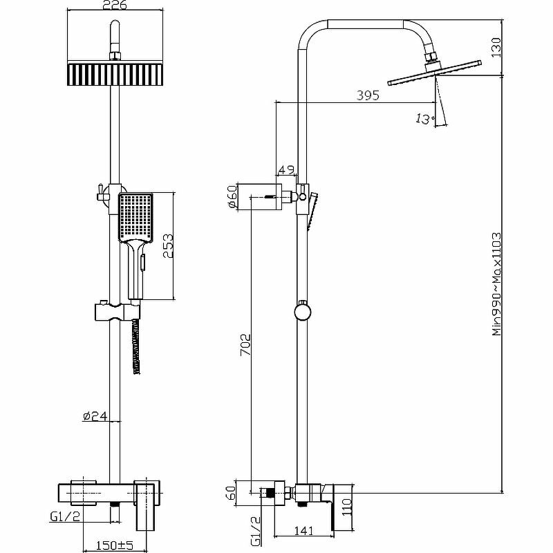 | Комплектация | Смеситель / верхний душ / ручная лейка / штанга / шланг для душа |