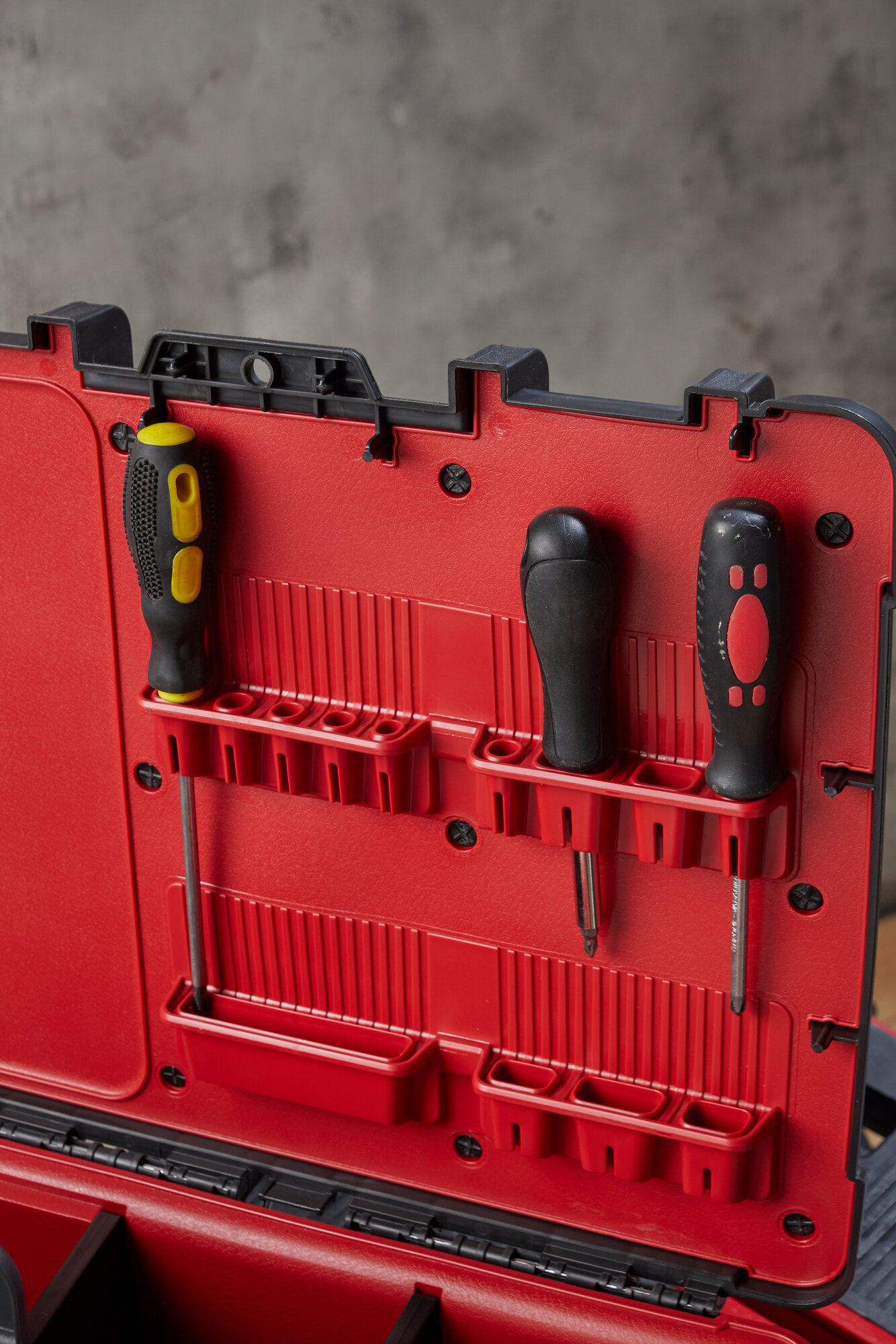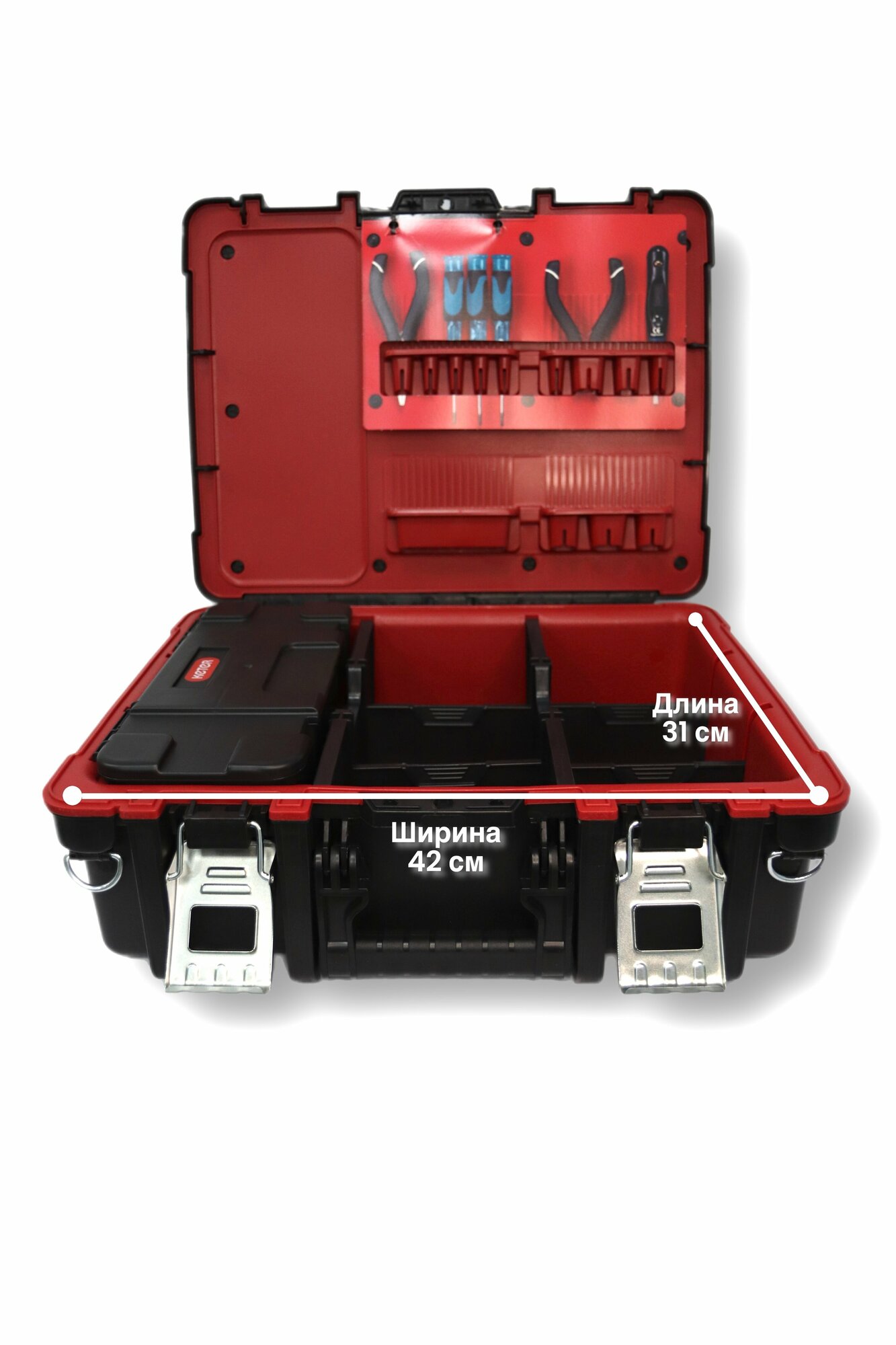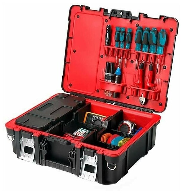 | Дополнительная информация | надежная металлическая ручка с мягкой рукоятью, надежные металлические защелки, крепления для инструмента под крышкой, съемный органайзер с регулируемыми резиновыми разделителями, уголки, предотвращающие скольжение |