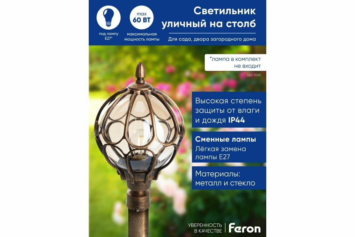 FERON Светильник садово-парковыйPL3803 круглый на столб 60W 230V E27, черное золото 11360