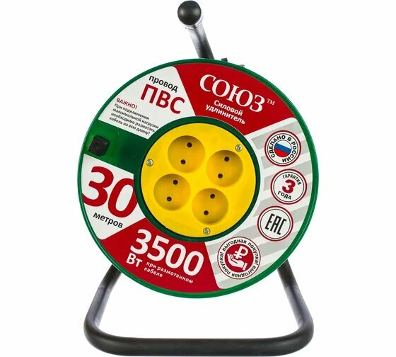 Удлинитель силовой "СОЮЗ", на катушке, 4 гнезда, 3500 Вт, 30 м
