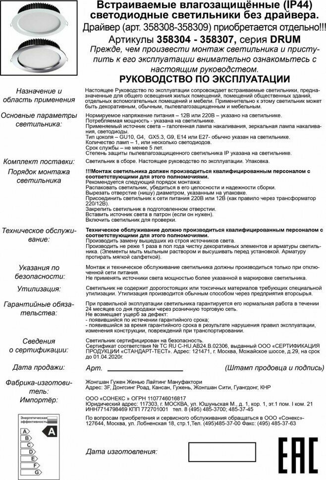 | Дополнительная информация | драйвер диммируемый/не диммируемый приобретается отдельно; угол рассеивания 120° |