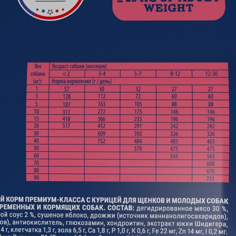 | Состав | курица 42%, рис, кукуруза, пшеница, куриный жир (консервирован токоферолами), рыбий жир из лосося, пивные дрожжи, натуральные ароматизаторы, сушеные яблоки, минеральные вещества, экстракт из трав и фруктов 300 мг/кг, глюкозамина гидрохлорид 260 мг/кг, хондроитина сульфат 160 мг/кг, маннанолигосахариды 150 мг/кг, фруктоолигосахариды 100 мг/кг, экстракт юкки Шидигера 80 мг/кг, органическая медь, органический цинк, органический селен |