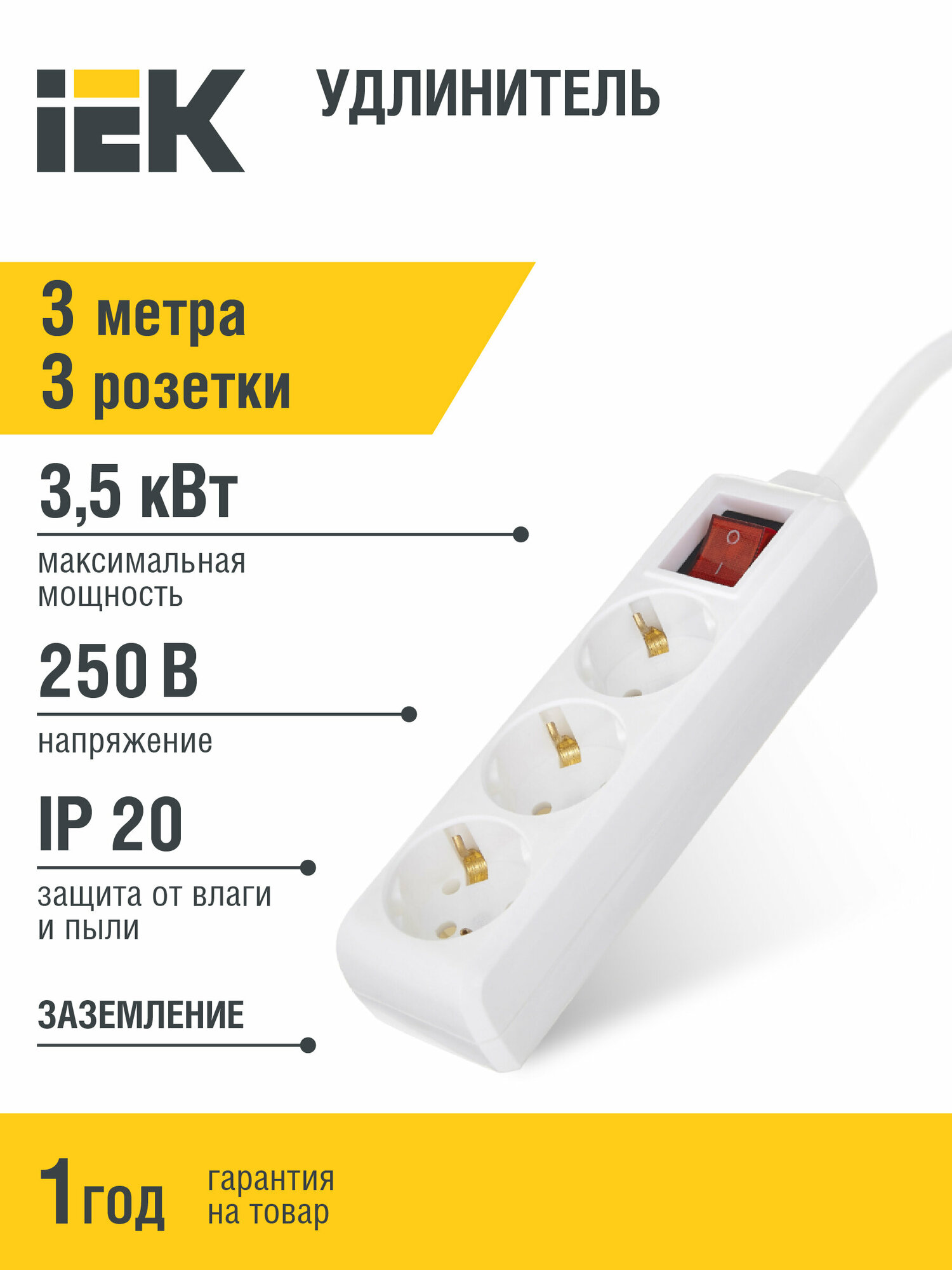 Удлинитель IEK WYP10-16-03-03-ZK-N, 3 розетки, 3 м, с/з, 16А / 3500 Вт