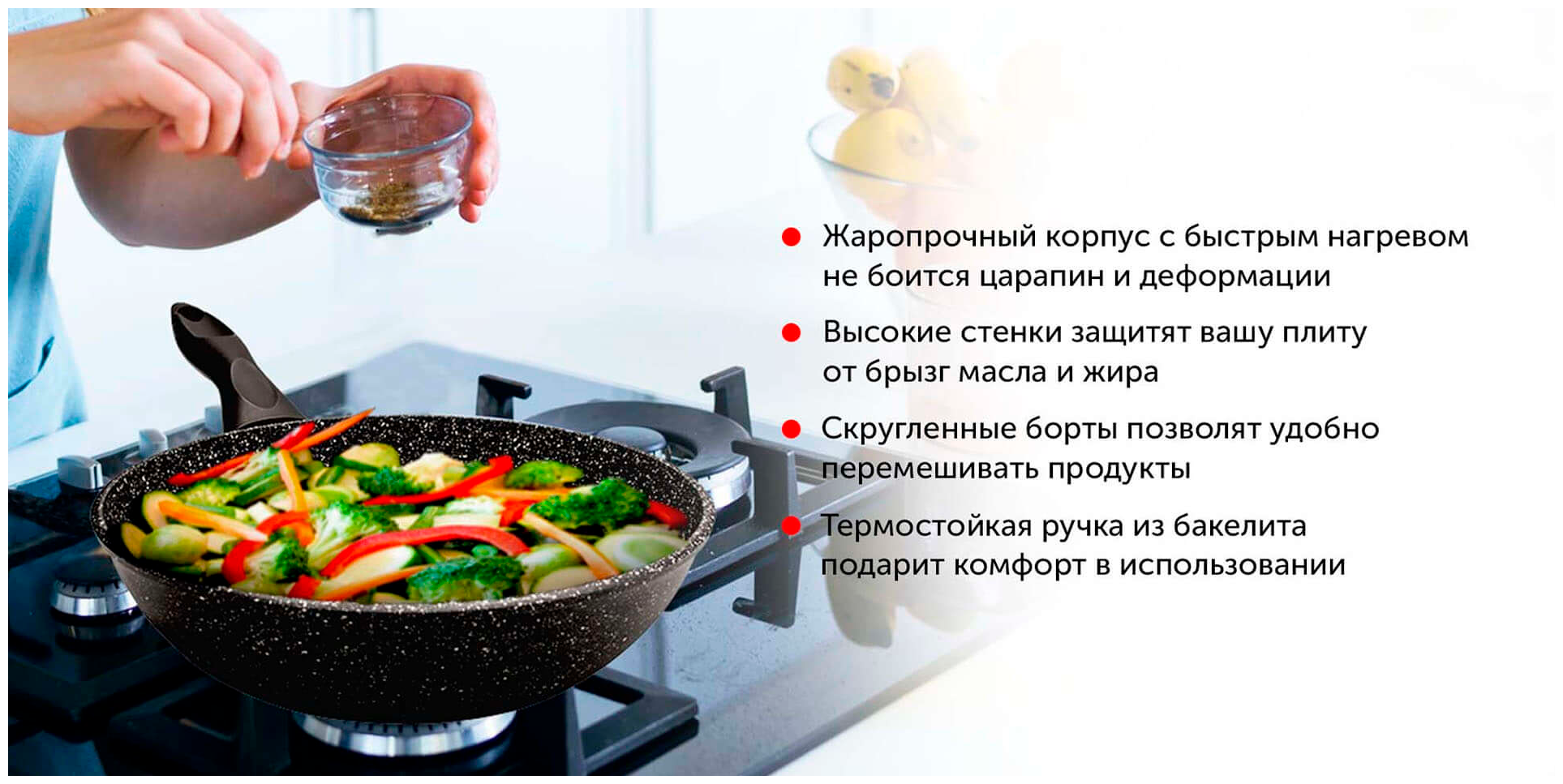 | Плюсы: | Качественная сборка, ручка не нагревается, диаметр 28 см |