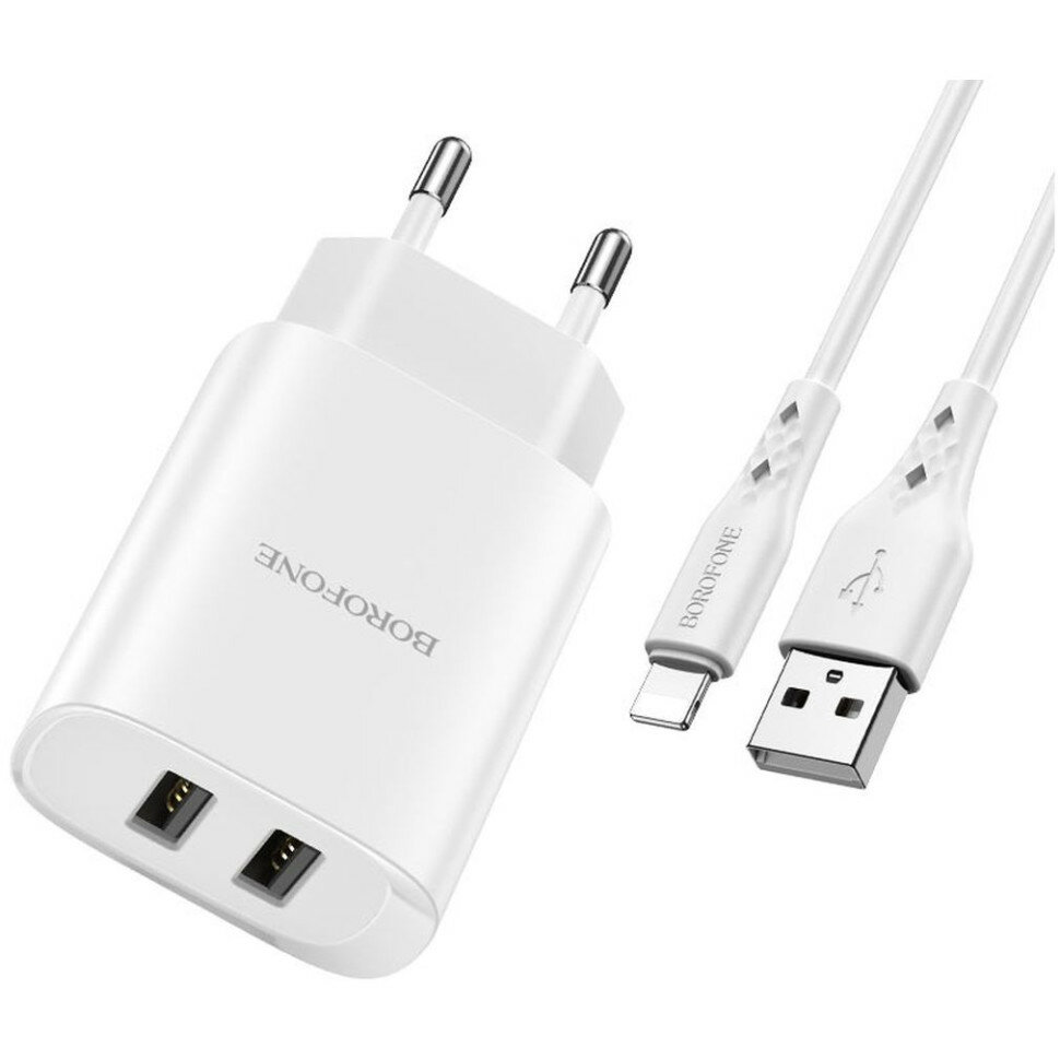 Купить Сетевое зарядное устройство (СЗУ) Borofone BN2 (2 USB) + кабель Lightning, 2.1 А, белый