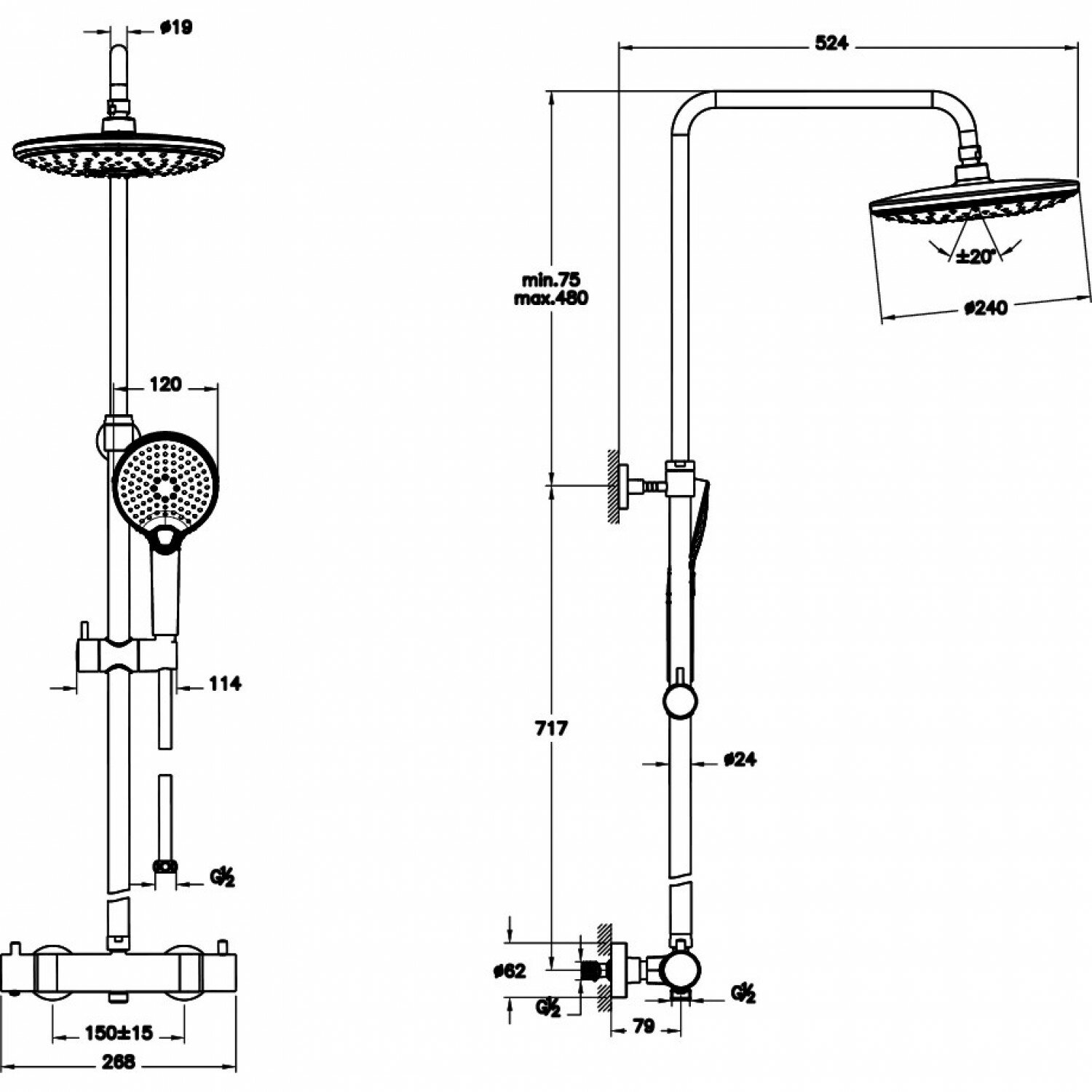 | Комплектация | душевая стойка с телескопической трубкой / верхняя лейка / шланги для подключения смесителя и ручного душа / ручной душ / держатель для душа / смеситель термостатный / инструкция |