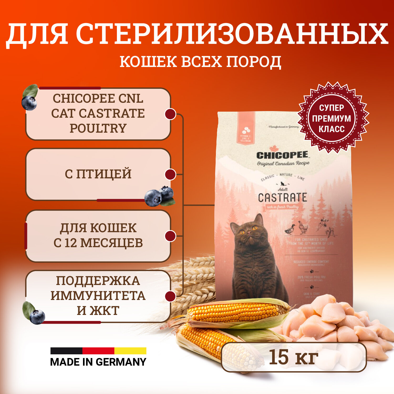 Чикопи ЦНЛ для стерилизованных кошек, птицей / Chicopee CNL Cat Castrate Poultry, 15 кг