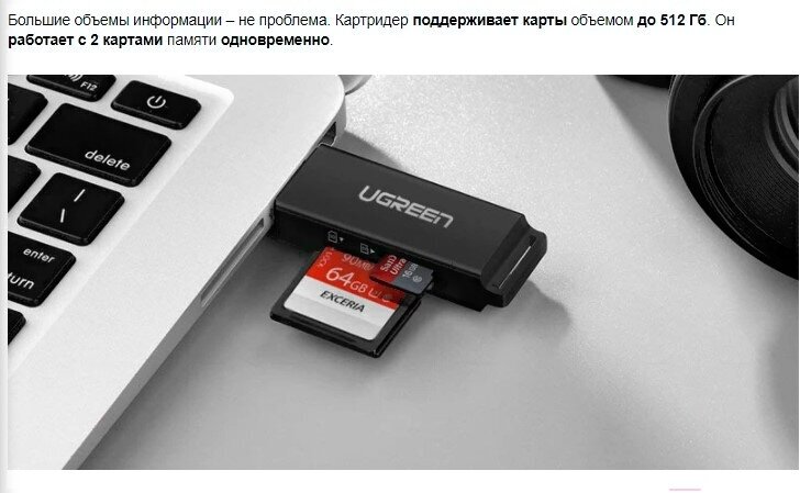 Картридер UGREEN CM104 (40752) USB 3.0 to TF + SD Dual Card Reader/черный интересное: