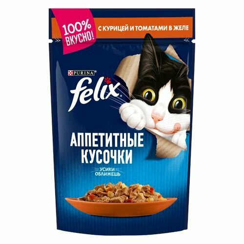 Корм для кошек FELIX Аппетитные кусочки с курицей и томатами в желе, пауч 85 г (упаковка - 26 шт)