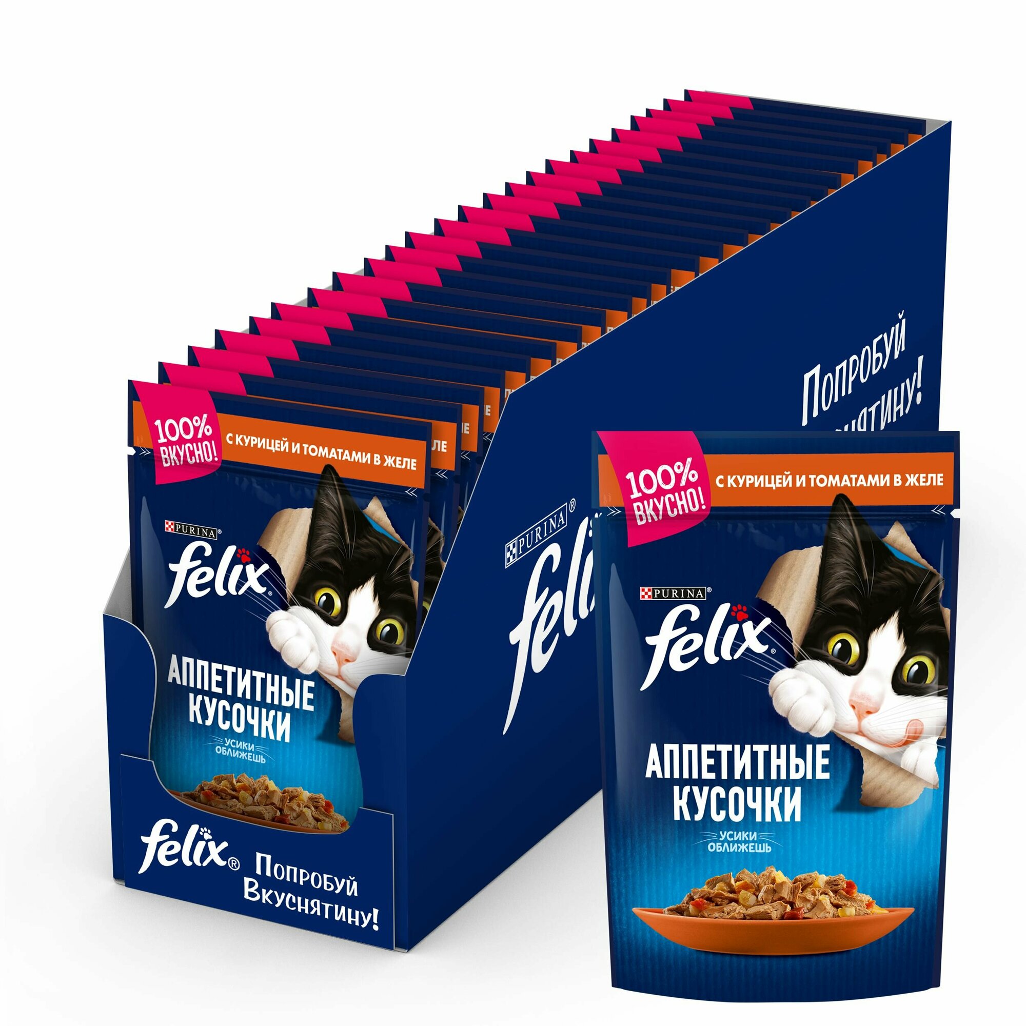 Купить FELIX аппетитные кусочки для взрослых кошек с курицей и томатами в желе (85 гр х 26 шт)