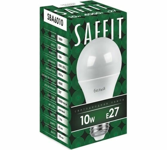 Лампа светодиодная SAFFIT SBA6010, A60, E27, 10 Вт, 230 В, 4000 К, 800 Лм, 220°, 108 х 60 мм 4335696