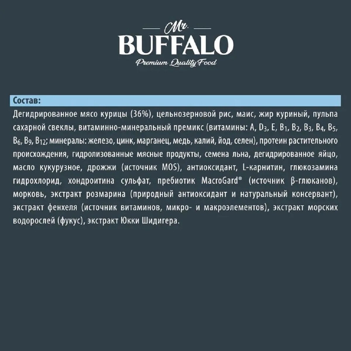 | Состав | дегидрированное мясо курицы (36%), цельнозерновой рис, маис, жир куриный, пульпа сахарной свеклы, витаминно-минеральный премикс (витамины: А, D3, E, B1, В2, В3, B4, B5, B6, B9, B12; минералы: железо, цинк, марганец, медь, калий, йод, селен), протеин растительного происхождения, гидролизованные мясные продукты, семена льна, дегидрированное яйцо, масло кукурузное, дрожжи (источник MOS), антиоксидант, L-карнитин, глюкозамина гидрохлорид, хондроитина сульфат, пребиотик MacroGard® (источник β-глюканов), морковь, экстракт розмарина (природный антиоксидант и натуральный консервант), экстракт фенхеля (источник витаминов, микро- и макроэлементов), экстракт морских водорослей (фукус), экстракт Юкки Шидигера |