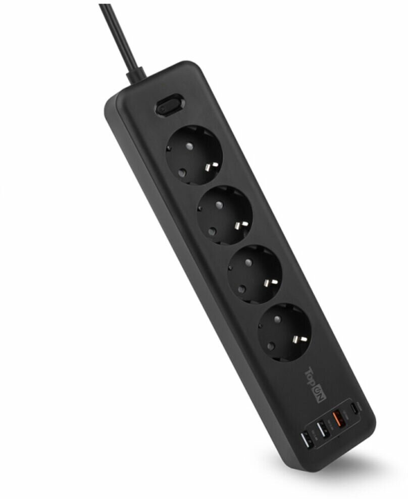 Сетевой фильтр TopON TOP-PWS4 на 4 розетки, 3 USB, Type-C, PD 20W QC3.0, 4000W, 1.8 м, чёрный