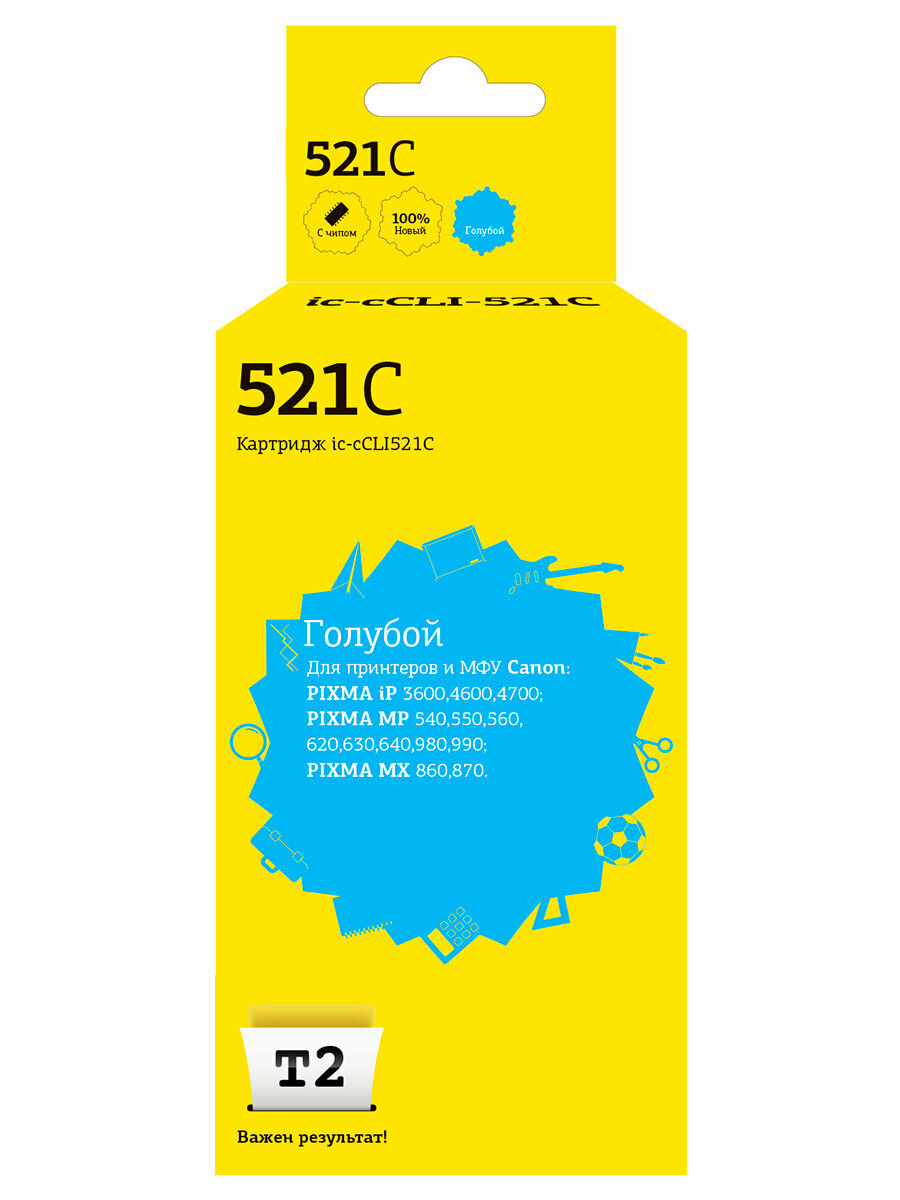 T2 Расходные материалы CLI-521C IC-CCLI-521C Картридж для Canon PIXMA iP3600 4600 4700 MP540 620 630 980, голубой, с чипом