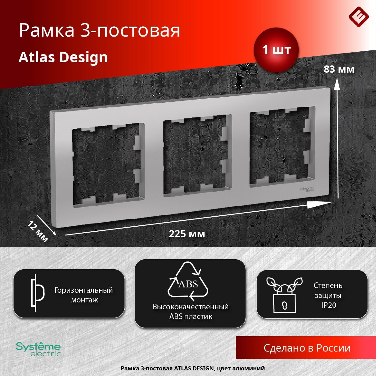 Рамка Systeme Electric Atlas Design тройная для розеток и выключателей алюминиевый - 3 шт.