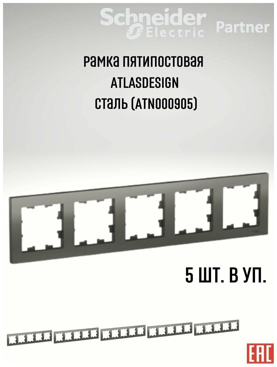 Купить Рамка для розетки выключателя пятерная Schneider Electric (Systeme Electric) Atlas Design Антибактериальное покрытие сталь ATN000905 5шт