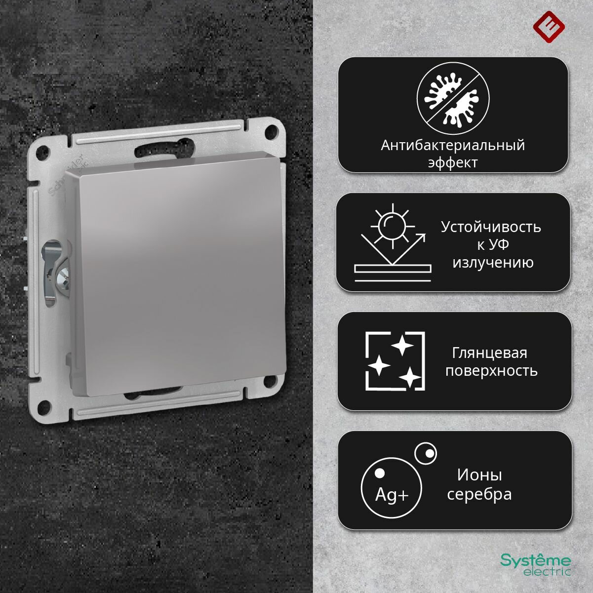 Выключатель электрический Systeme Electric Atlas Design 1-клавишный, 10А, 10 AX, Сталь ATN000911 - 10 шт.